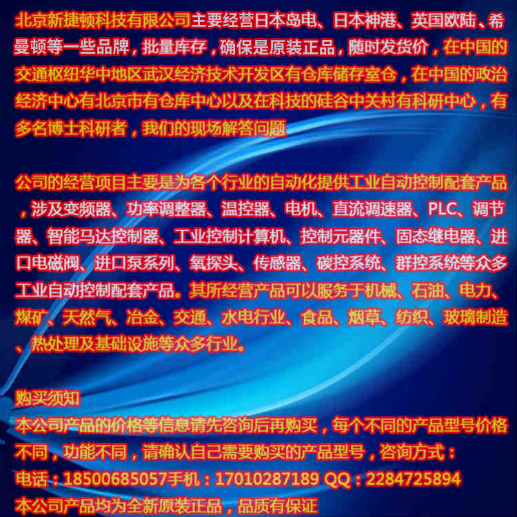 主营:神港、岛电、岛通、希曼顿、台基全系列以及基恩士、欧陆、欧姆龙、堡盟等,有温控表、模块、传感器、调整器等。公司所有产品都是全新原装的。请放心购买,任何一台表都可以去计量院检测。有需要请联系我,微信号就是手机号。